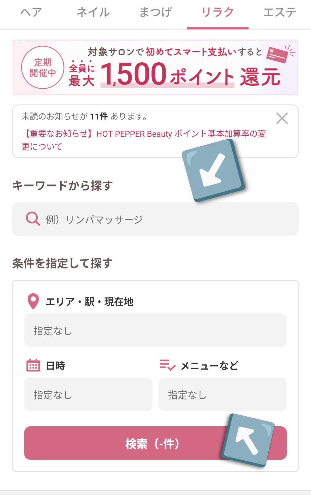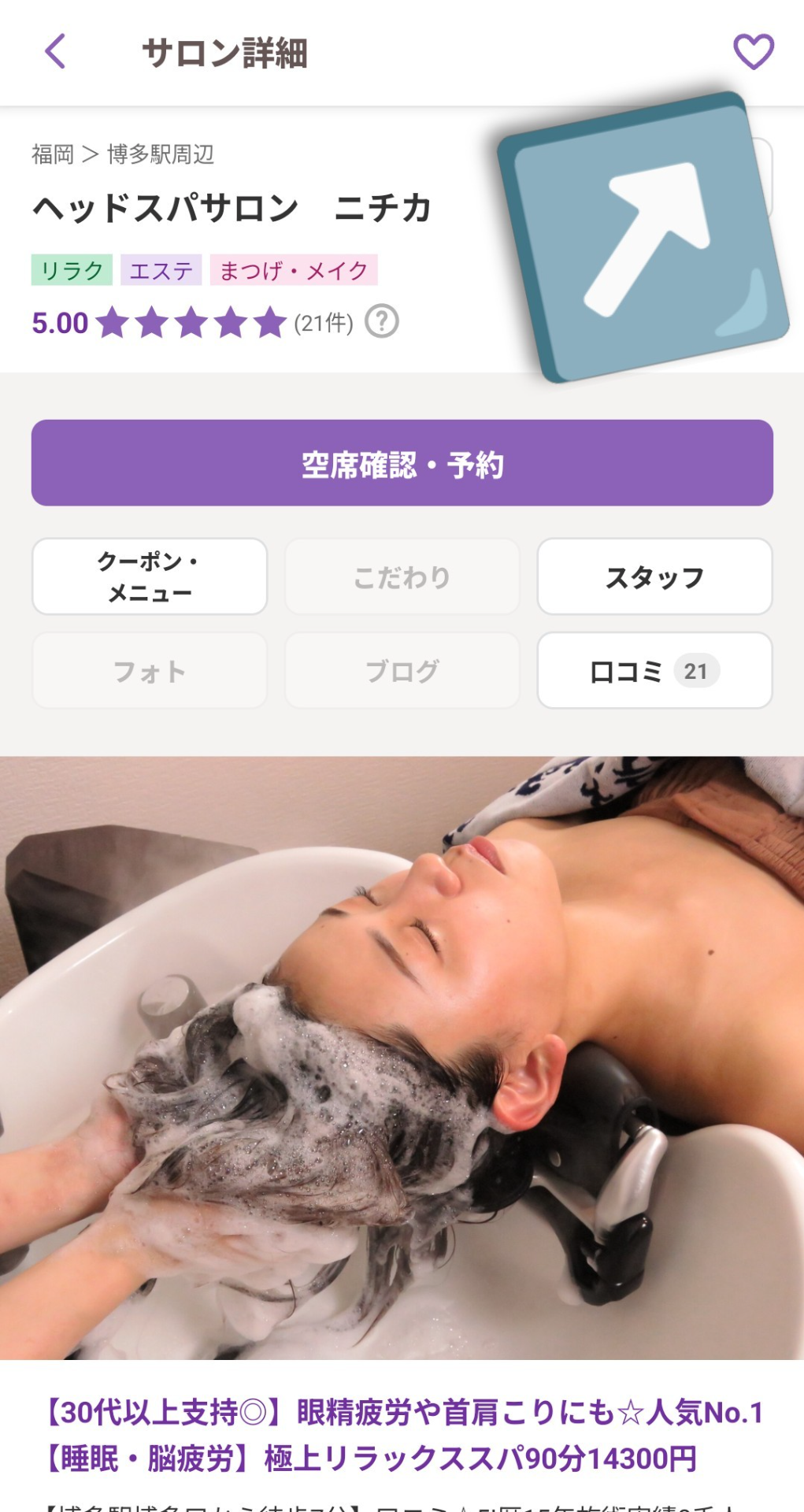 エリアやメニューに「博多駅」や「ヘッドスパ」と入力しても